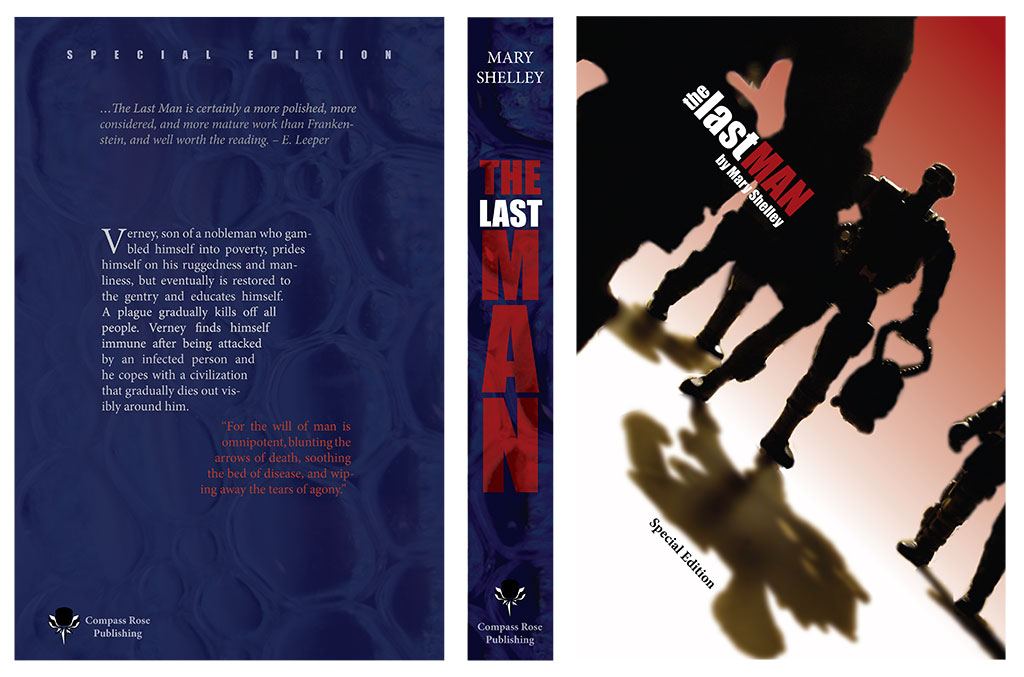 Part of designing the book cover included creating a fictional publishing company with a logo. I adapted the idea within 'The Last Man' of someone traversing the unknown needing a compass. Thus, I took a traditional compass layout and melded it with an abstract rose flower. The above image is a size compilation of the logo that has been recently updated to appear more dimensional while maintaining the sole use of line art.