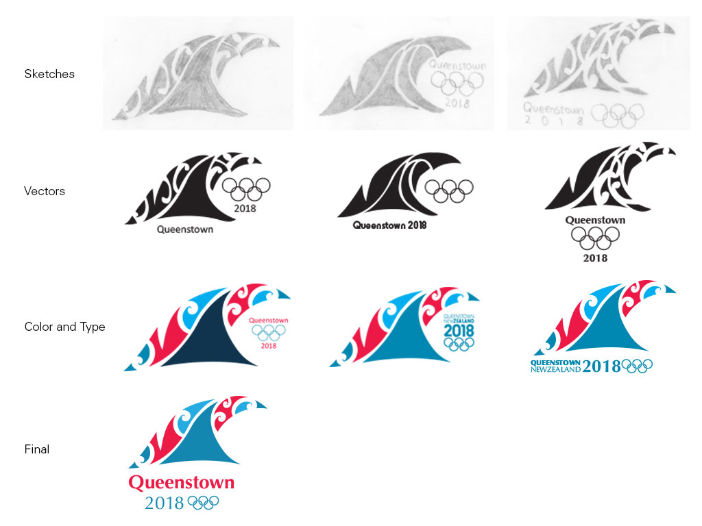 I chose a wave to represent the adventurous nature of New Zealand and combined it with the stylization found in many pieces of art in the Maori culture. Through the revision process the symbol's lines were cleaned up, the type was refined and the color palette was finalized.